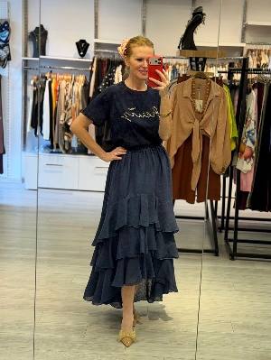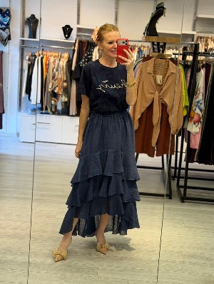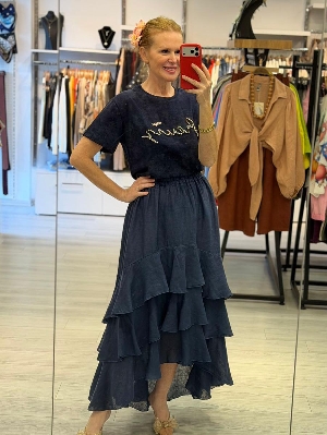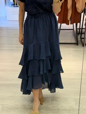 İtalyan Volan Detay Lacivert Renk Keten Etek