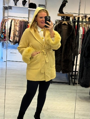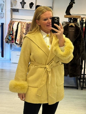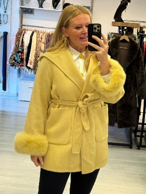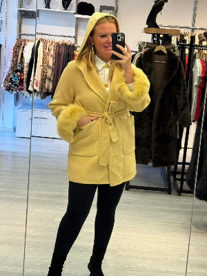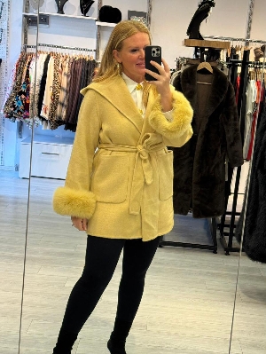 İtalyan Peluş Detaylı Sarı Kaşmir Kaban