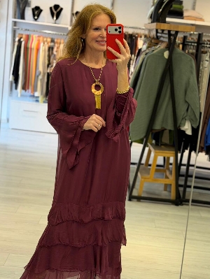 Bordo Renk Volanlı Tamamen Astarlı İpek Elbise