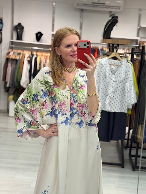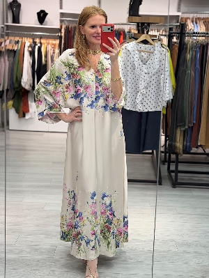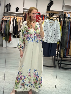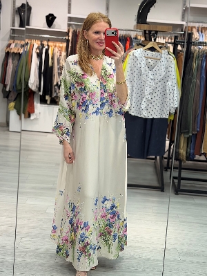 İpek Saten Çiçek Desen Beyaz Uzun Elbise