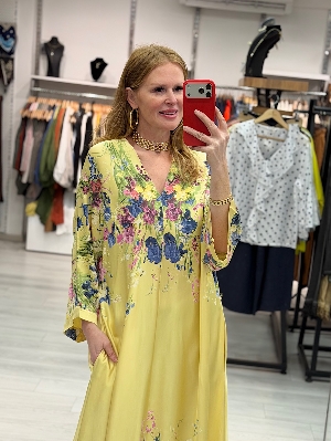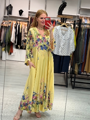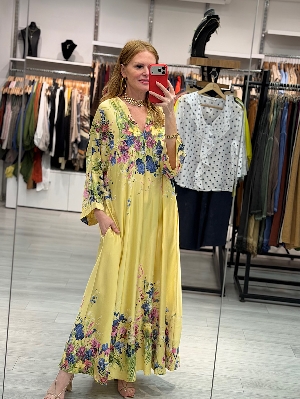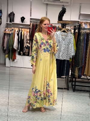 İpek Saten Çiçek Desen Sarı Uzun Elbise