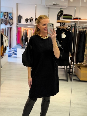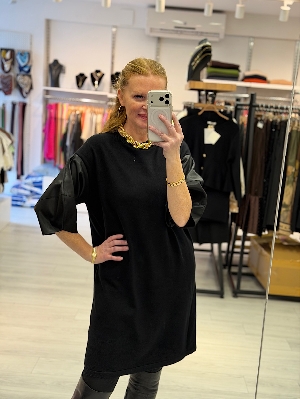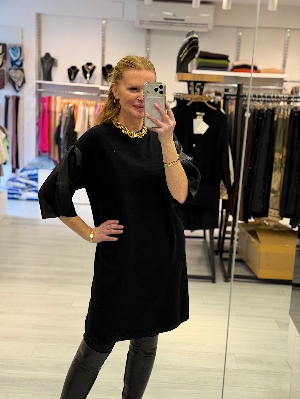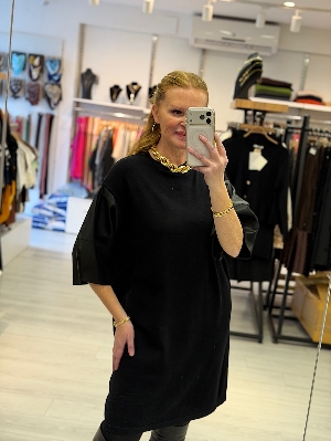 İtalyan Deri Kol Detay Siyah Renk Çelik Örme Triko Elbise