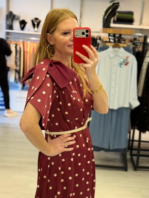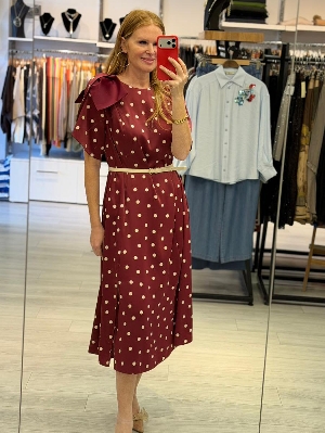 İtalyan Fiyonk Detay Puantiye Saten Elbise Bordo