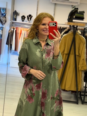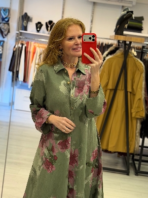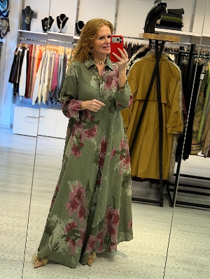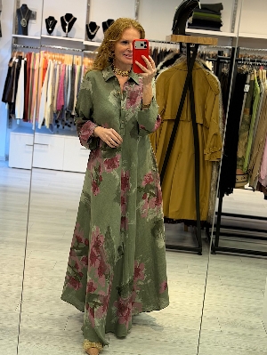 İtalyan Haki Renk Çiçek Detay Uzun Keten Elbise