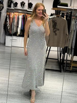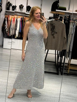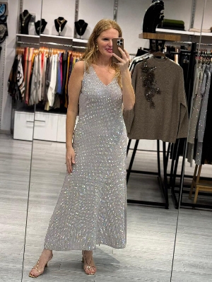 İtalyan Taş Detay Çelik Örme Merserize Elbise Gümüş