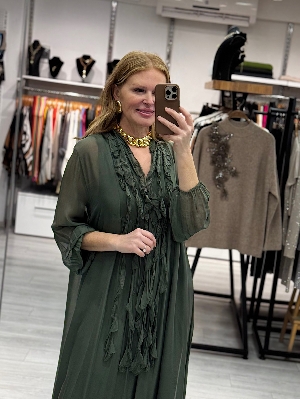 İtalyan Volan Detay Haki Renk İpek Elbise