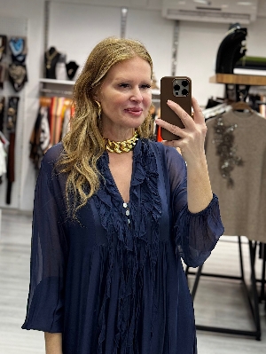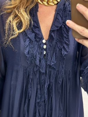 İtalyan Volan Detay Lacivert Renk İpek Elbise