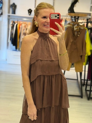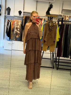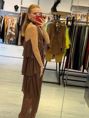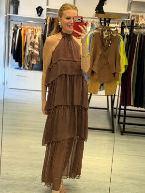 Sırt Detay Kat Kat İpek Elbise Kahve