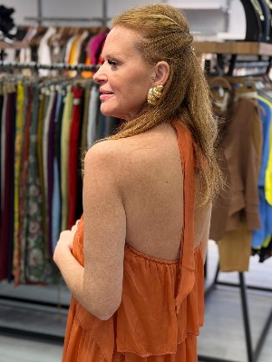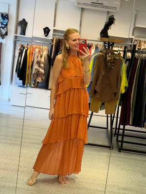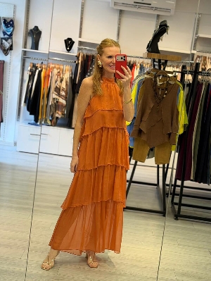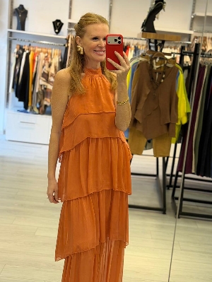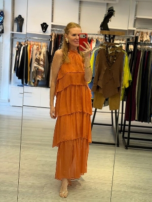 Sırt Detay Kat Kat İpek Elbise Kiremit