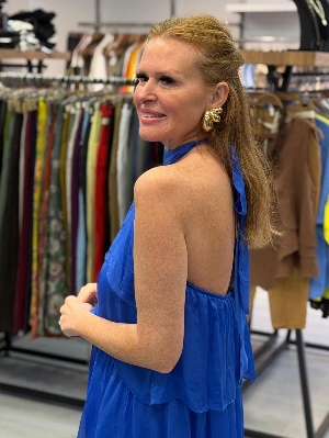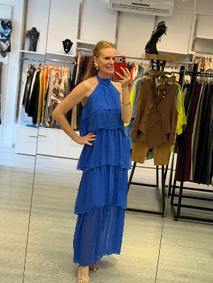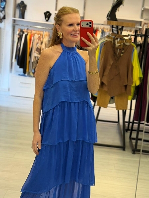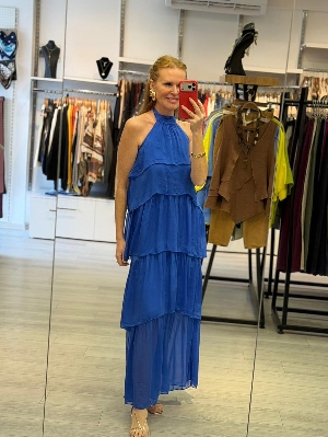 Sırt Detay Kat Kat İpek Elbise Saks