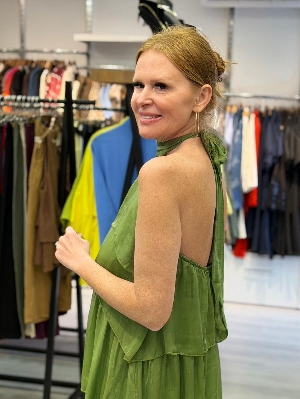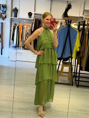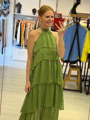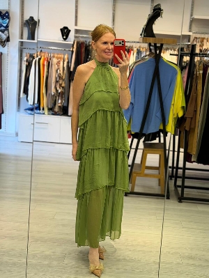 Sırt Detay Kat Kat İpek Elbise Yeşil