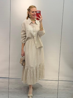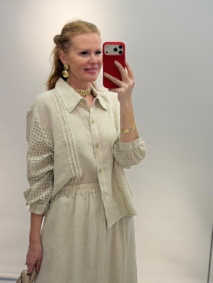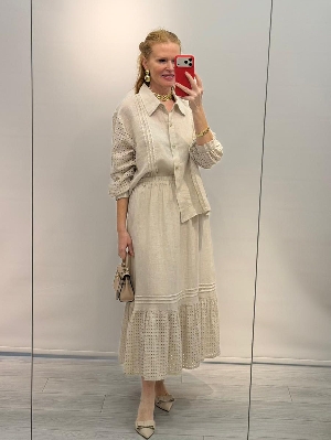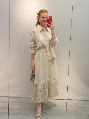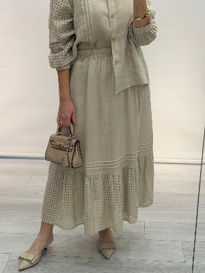 Bej Renk Kafes Detay Etekli Keten Takım