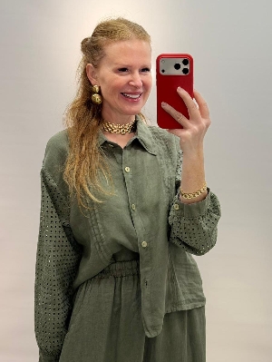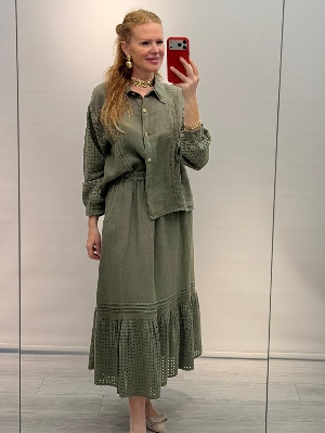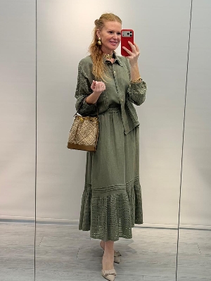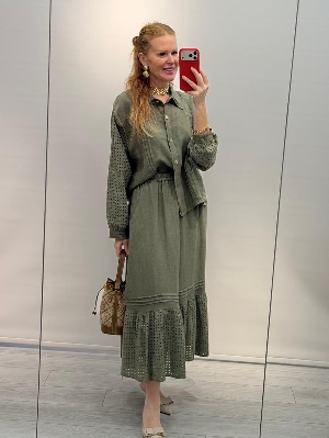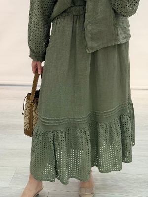 Haki Renk Kafes Detay Etekli Keten Takım