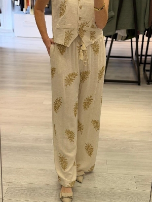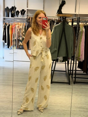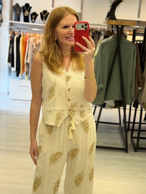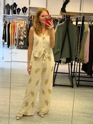 İtalyan Bej İşleme %30 Keten %70 Pamuk Yelekli Takım