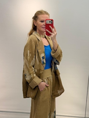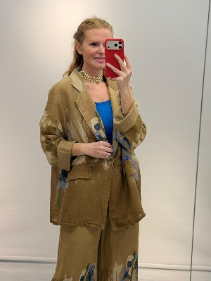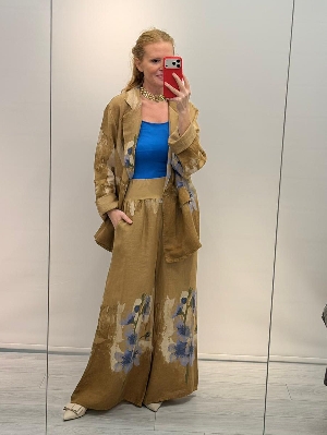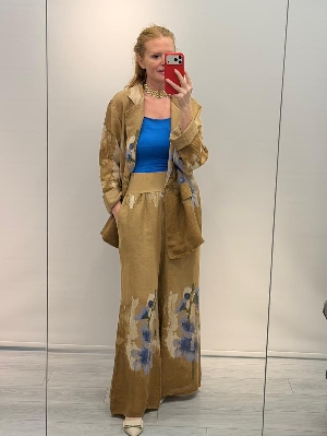 İtalyan Camel Renk Çiçek Detay Ceket Keten Takım