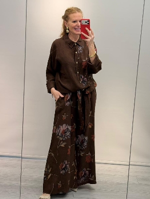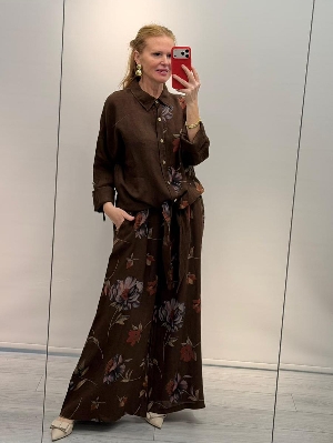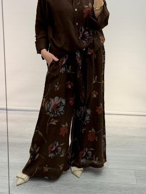 İtalyan Çiçek Detay Kahve Renk Keten Takım