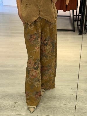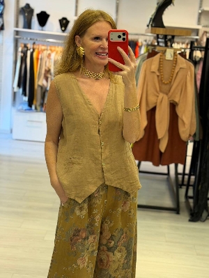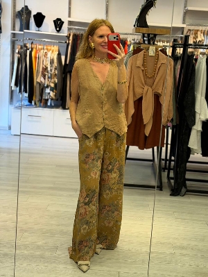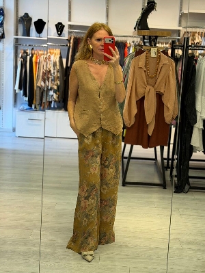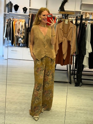 İtalyan Çiçek Detay Keten Yelekli Takım Camel