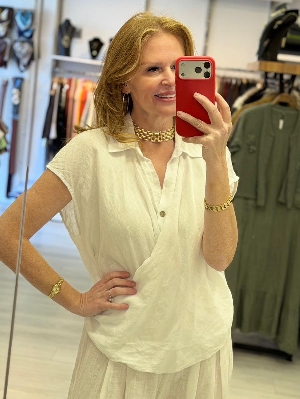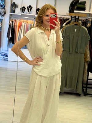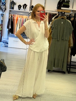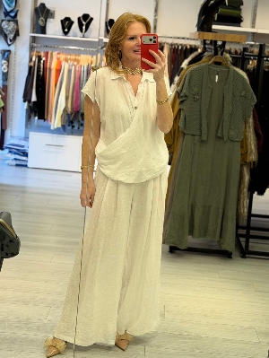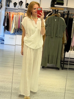 İtalyan Düşük Kol Beyaz Renk Kruvaze Keten Takım