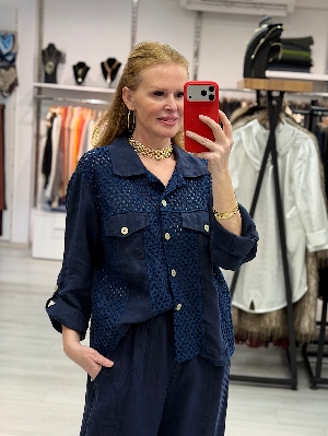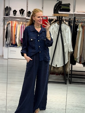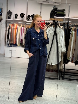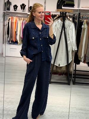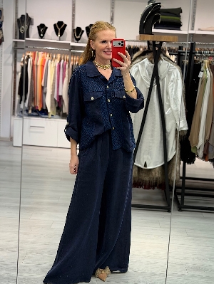 İtalyan File Detay Lacivert Renk Keten Takım