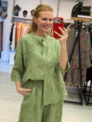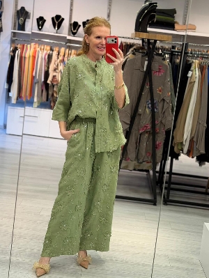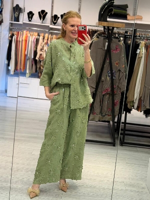 İtalyan İş Detay Yeşil Renk Keten Takım