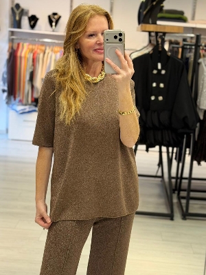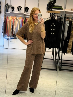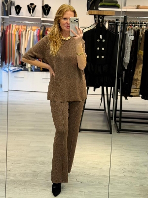 İtalyan Kahve Renk Çelik Örme Pırıltı Detay Triko Takım