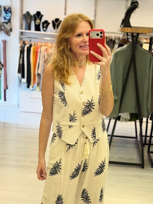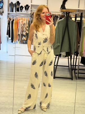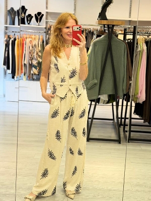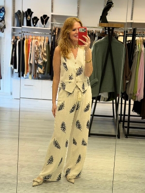 İtalyan Lacivert İşleme %30 Keten %70 Pamuk Yelekli Takım