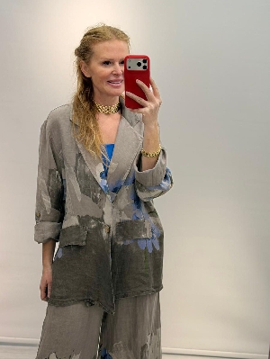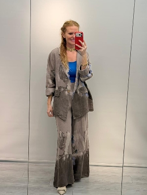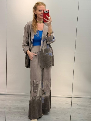 İtalyan Vizon Renk Çiçek Detay Ceket Keten Takım