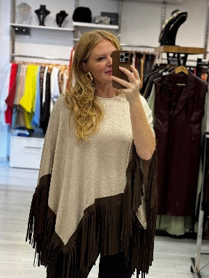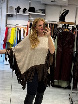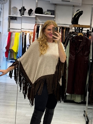çelik örme italyan triko süet püskül detaylı panço.