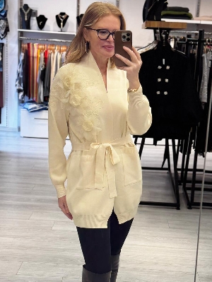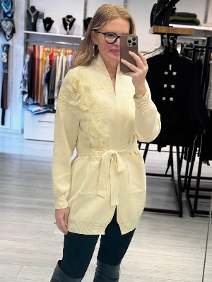 İtalyan Çiçek Detay Ekru Renk Çelik Örme Triko Hırka
