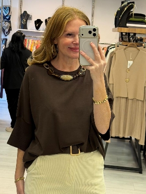 İtalyan Kolye Detay Kahve Renk Çelik Örme Triko Bluz